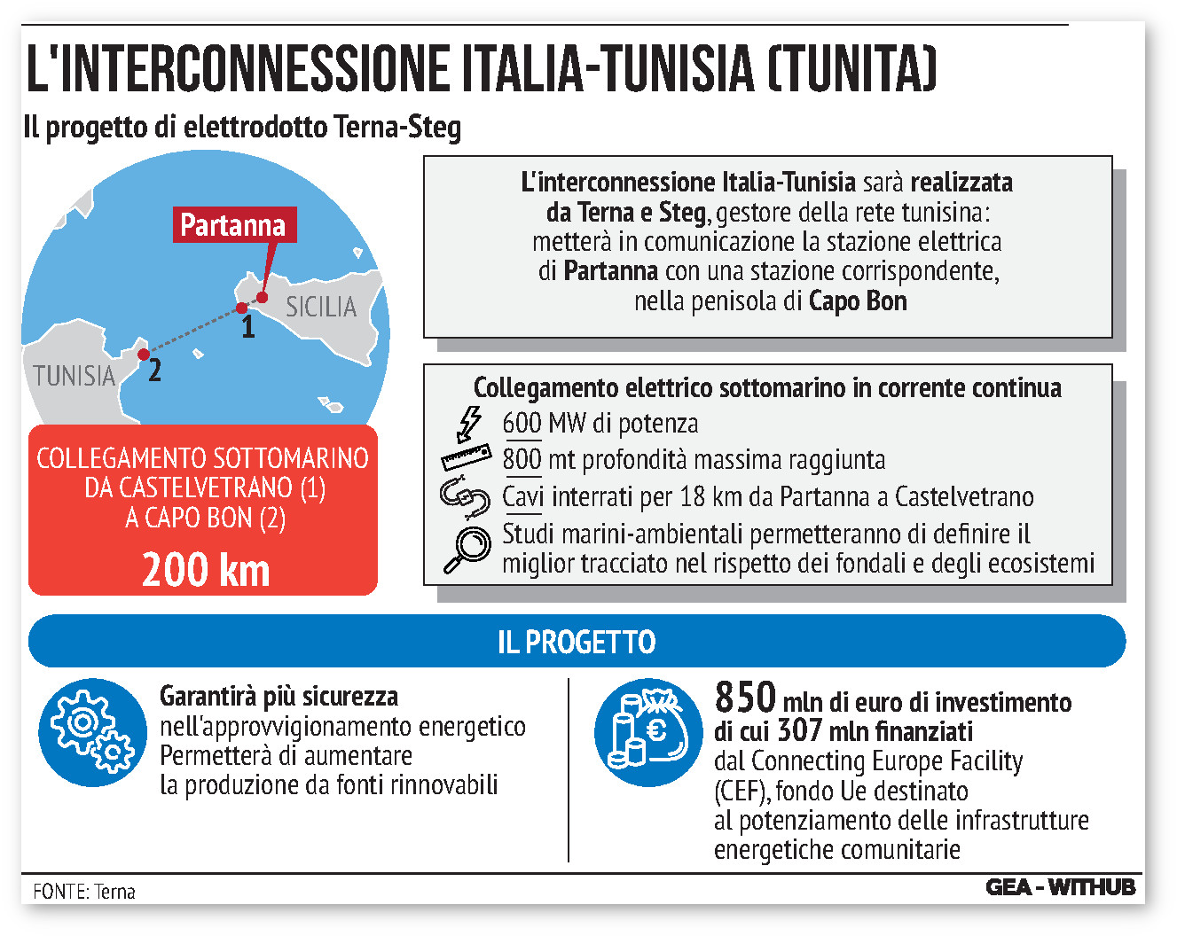 Il riferimento è proprio al programma “Elmed”, che vede impegnate Terna e la tunisina Steg nella posa del cavidotto sottomarino “Tunita” da 600 MW in corrente continua, un ponte energetico lungo 200 km tra Kelibia e Castelvetrano-Partanna. Un’opera da 850 milioni, di cui 307 milioni cofinanziati dalla Commissione Ue di von der Leyen e che l’ambasciatore d’Italia a Tunisi, Fabrizio Saggio, ha definito «il progetto del secolo». La parte italiana è oggetto di procedimento autorizzativo avviato dal ministero dell’Ambiente.