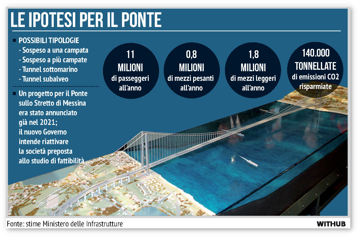 La nota, intitolata «La scommessa dell’Italia davanti al mondo: il ponte tra Sicilia e Calabria», presenta in inglese, e poi in italiano, le caratteristiche dell’opera. «Sarà il ponte strallato più lungo al mondo, il fiore all’occhiello della ingegneria italiana: 3,2 km a campata unica per traffico veicolare e ferroviario. Il Ponte sullo Stretto di Messina (tra Sicilia e Calabria) è la sfida - prosegue la nota - del vicepremier e ministro delle Infrastrutture e dei Trasporti Matteo Salvini e di tutto il governo di centrodestra, da pochi mesi alla guida del Paese. Un’opera imponente di cui si parla da decenni e la cui realizzazione diventa concreta: all’indomani dell’approvazione in Consiglio dei ministri del decreto che dà nuova vita alla società Stretto di Messina, si prevede per luglio 2024 la progettazione esecutiva e l’inizio dei lavori. Il Ponte rappresenta un importante volano dell’economia nazionale e uno dei corridoi strategici nella politica economica dell’Unione, in grado di collegare la Sicilia al resto d’Europa».