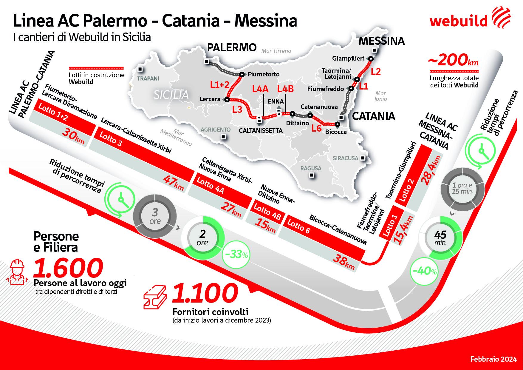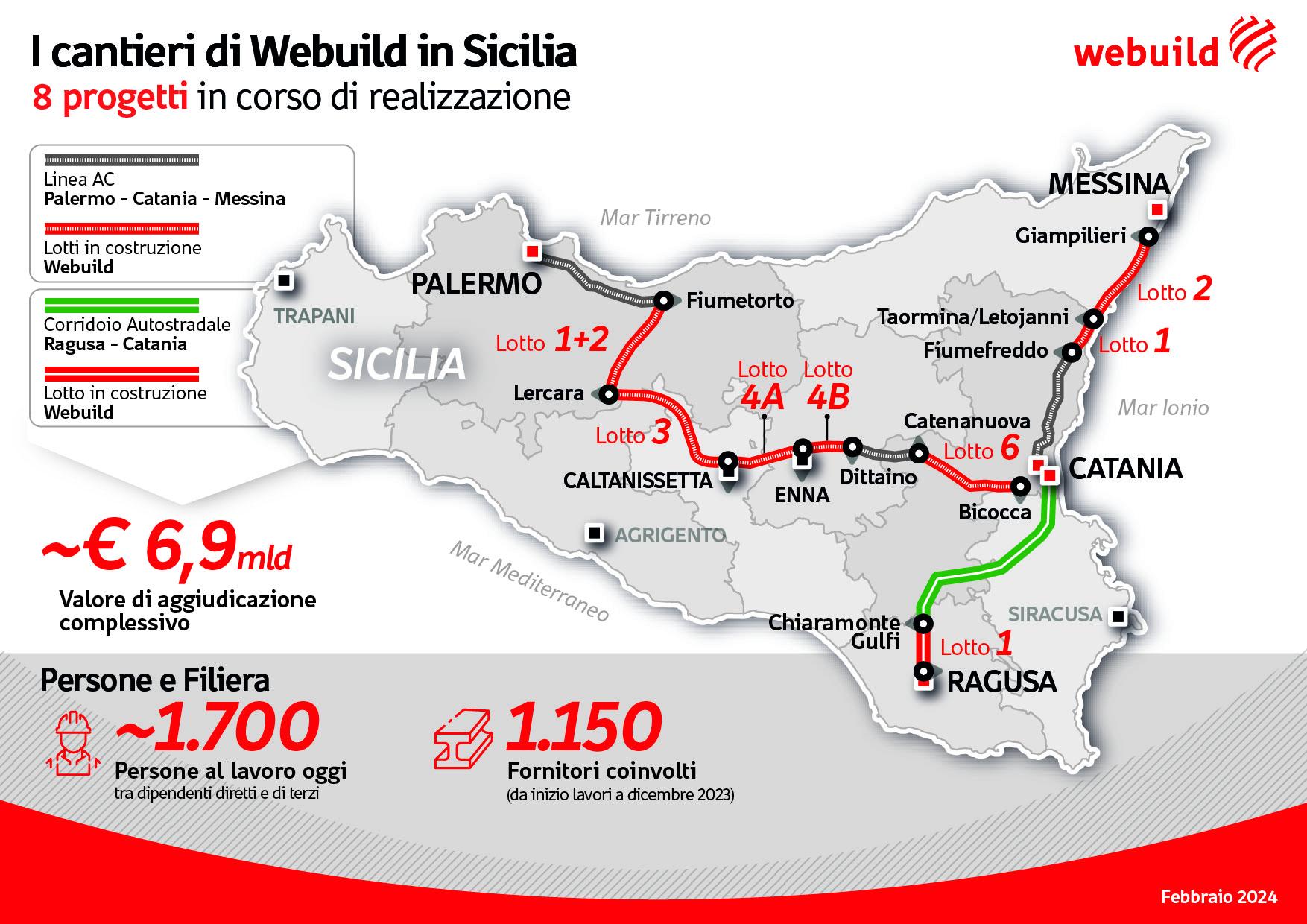 Sono 7.000 i posti di lavoro stimati necessari nel complesso per realizzare i grandi progetti che Webuild ha in corso in Sicilia, con 1.700 persone già oggi impegnate nei cantieri, tra diretti e terzi. Obiettivo del gruppo, all’opera sugli otto progetti affidati da Rfi e Anas, gruppo Fs, è contribuire a rivoluzionare la mobilità sostenibile dell’Isola nei prossimi anni, in particolare sulla direttrice Palermo-Catania-Messina, creando in parallelo sviluppo e lavoro specializzato, con una formazione professionale specifica realizzata in collaborazione con la Regione Siciliana.