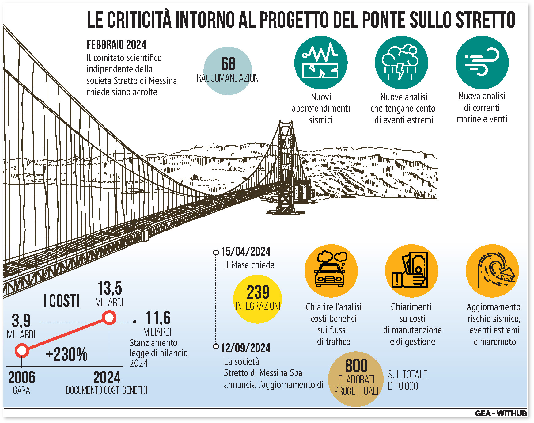 Al di là degli aspetti giudiziari l’iter per l’opera prevede che, una volta avuto l’ok del Cipess - il Comitato interministeriale per la programmazione economica e lo sviluppo sostenibile presieduto dalla presidente del Consiglio, Giorgia Meloni -, parta il programma dei lavori. Anzitutto con le operazioni propedeutiche alla cantierizzazione, la risoluzione delle interferenze, la bonifica dei territori da ordigni bellici, essendo entrambe le sponde state bombardate nel '43. Andranno anche effettuate indagini archeologiche, geognostiche e geotecniche. Dunque, saranno predisposti i campi base.