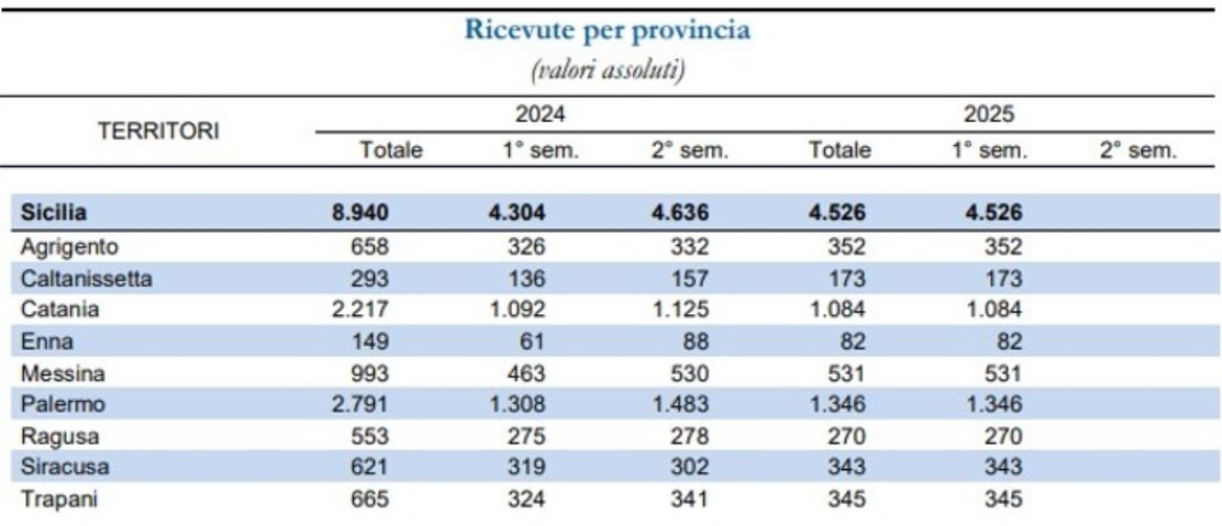 “A livello provinciale in Sicilia spiccano Palermo con 1.346 segnalazioni e Catania con 1.084. Seguono Messina con 531 segnalazioni, Agrigento con 352, Trapani 345, Siracusa con 343, Ragusa con 270, Caltanissetta con 173 ed Enna con 82”.