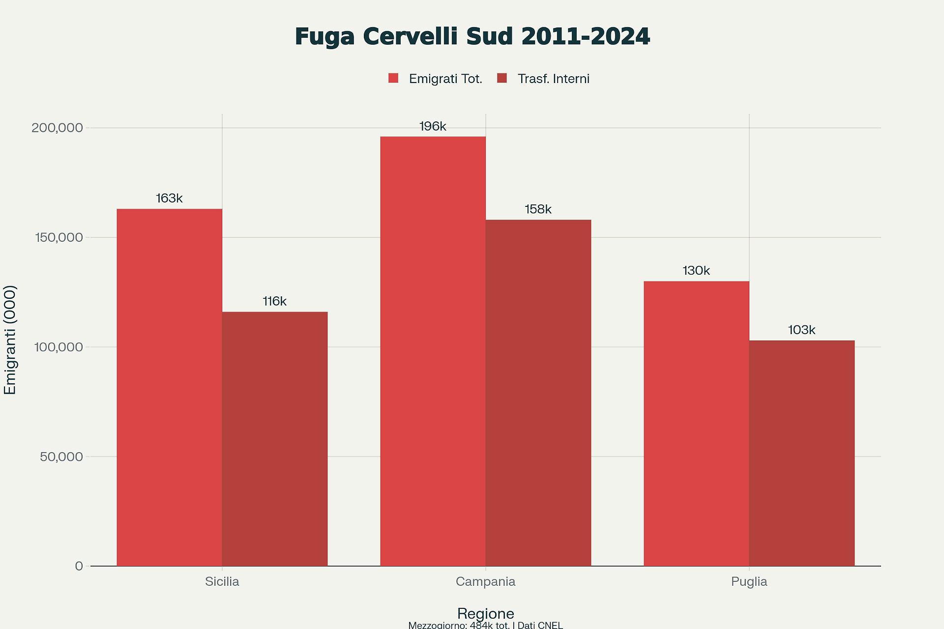 Tra il 2011 e il 2024, il 35% dei 630mila giovani italiani (18-34enni) emigrati all'estero proviene dal Mezzogiorno, con un saldo netto nazionale di -441mila unità; nel 2024 le partenze sono state 78mila, saldo -61mila. In Sicilia, l'esodo è drammatico: 116mila giovani verso Centro-Nord (163mila totali tra estero e interno), seconda solo alla Campania (158mila/196mila). Questo deflusso, aggravato da 484mila trasferimenti Sud-Nord per 147 miliardi di euro, impoverisce demograficamente e economicamente il Sud.