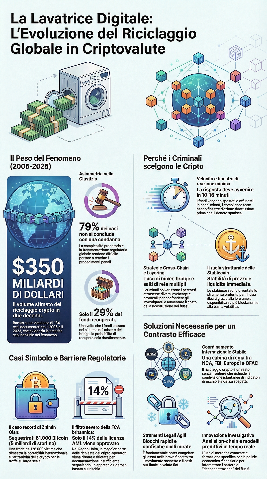Almeno 350 miliardi (2005-2025), operazioni in 10-15 minuti tra mixer, stablecoin e frammentazione che mettono in crisi indagini e regole
