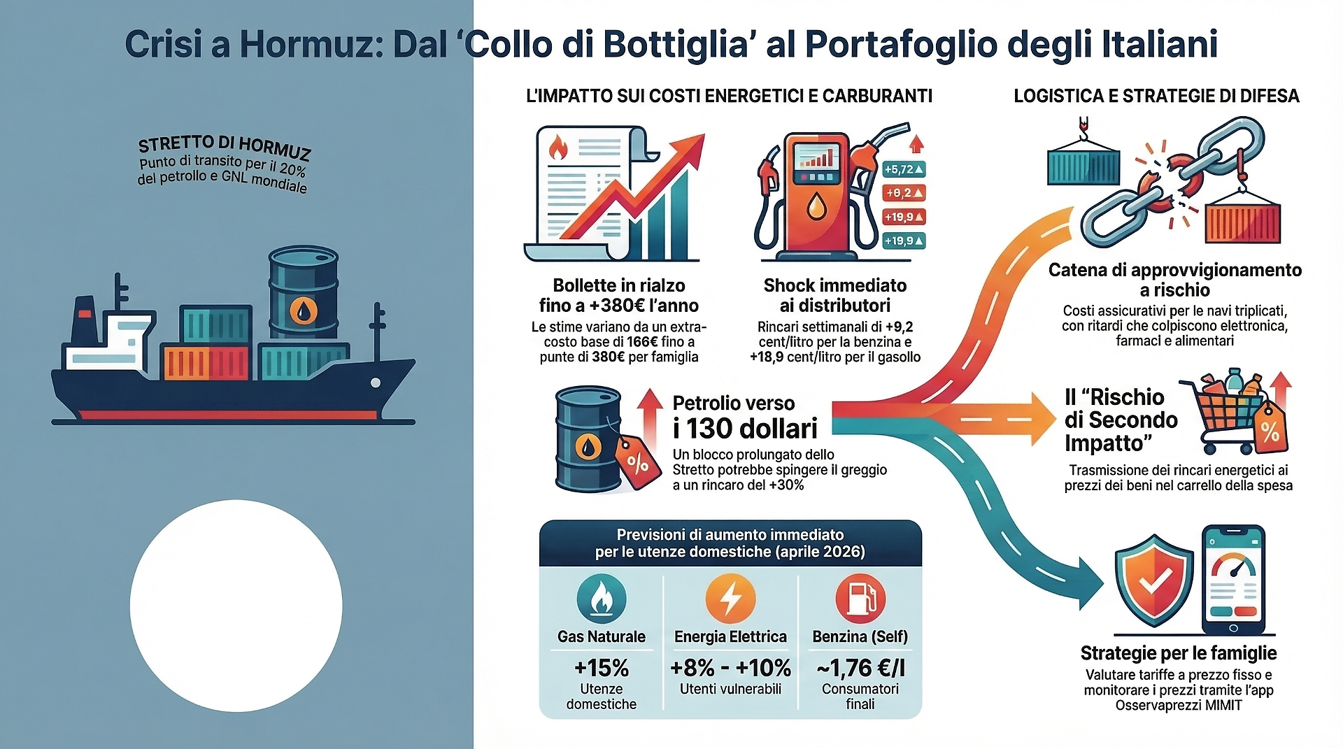 Un blocco totale, o anche una marcata contrazione dei flussi, trasformerebbe in breve una crisi geopolitica in un autentico shock energetico internazionale. Nel caso peggiore, la paralisi del corridoio potrebbe sottrarre al mercato nell’immediato il 15-20% dell’offerta. Diverse banche d’affari stimano che, qualora l’interruzione si protraesse, le quotazioni del greggio potrebbero impennarsi fino a +30%, raggiungendo l’area dei 120-130 dollari al barile.
