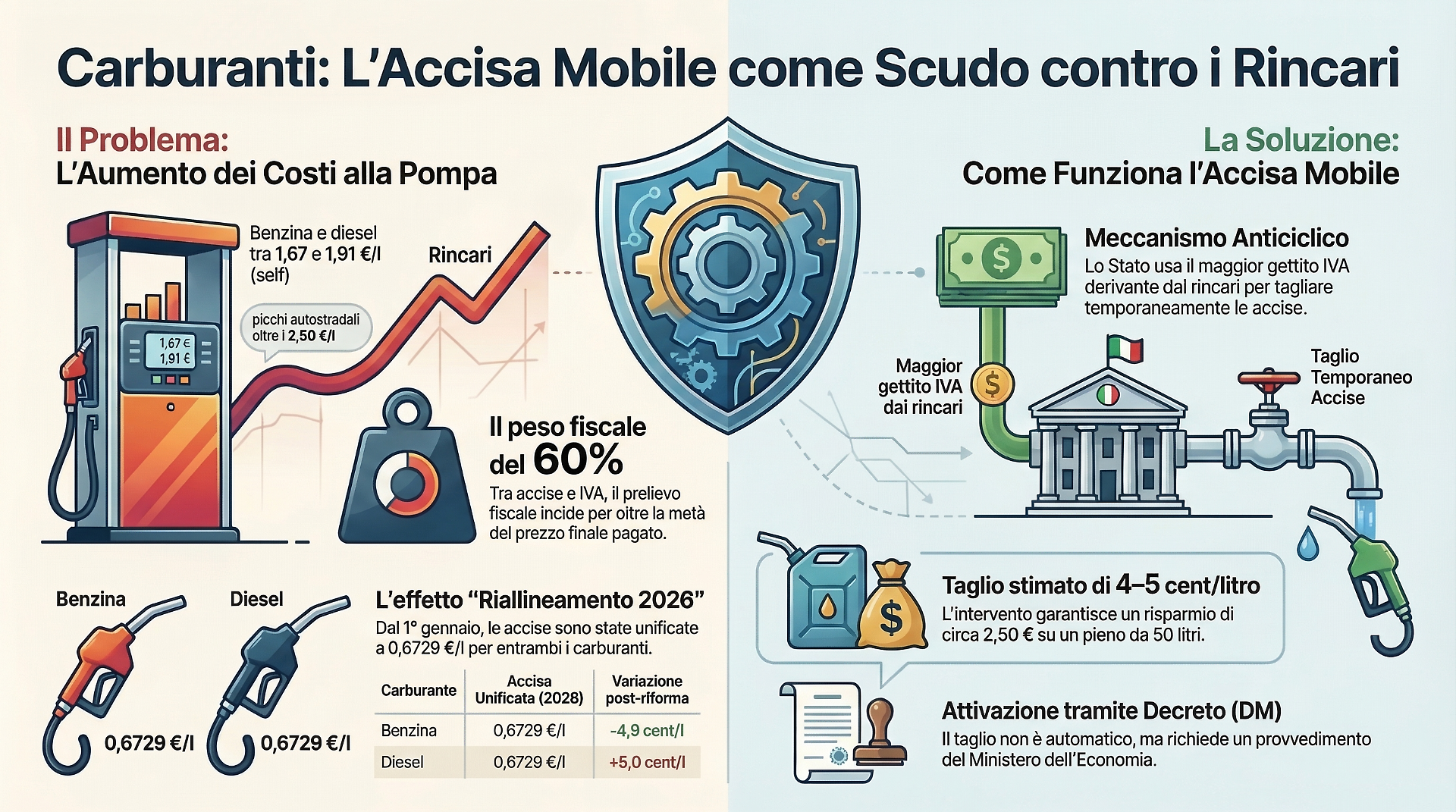 Il tutto si inserisce in un quadro fiscale profondamente mutato: dal 1° gennaio 2026 l’Italia ha riallineato le accise di benzina e gasolio a 0,6729 €/l, con l’obiettivo ambientale di eliminare lo storico vantaggio del diesel.