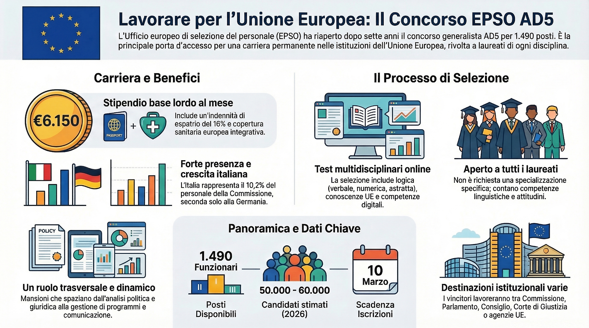 Se aspirate a una carriera di alto livello con uno stipendio tra i più alti sul mercato, l'opportunità che desideravate è qui. Fino al 10 marzo, l'Ufficio europeo di selezione del personale (Epso) ha riaperto le iscrizioni al concorso generalista AD5, la via principale per un posto fisso nelle istituzioni dell'Unione Europea. Un evento epocale: il bando riappare dopo sette anni di pausa, offrendo 1.490 posizioni per amministratori europei.