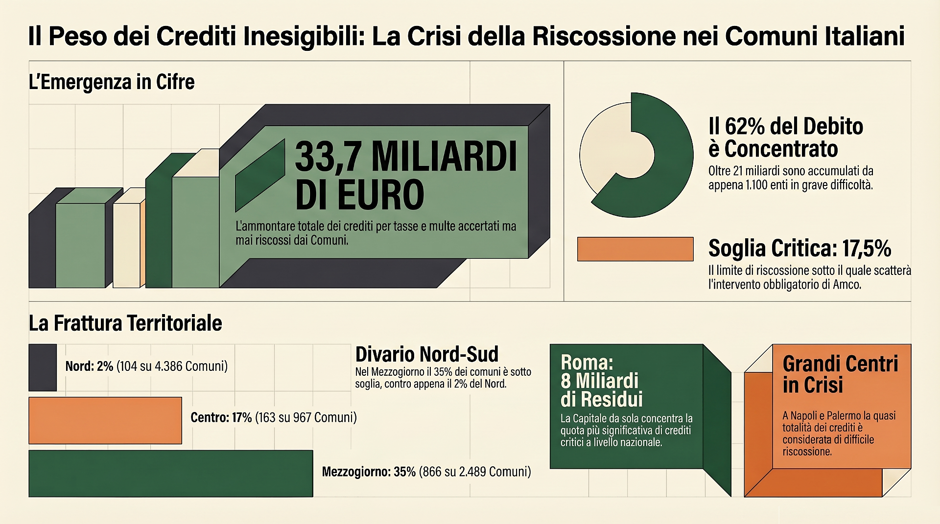 Una paralisi amministrativa cronica, in linea con quanto accade in altri grandi centri del Sud come Napoli — dove gran parte dei 3,5 miliardi di crediti è considerata a rischio — e Reggio Calabria.