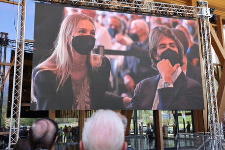 Leonardo Maria Del Vecchio sul maxischermo durante il funerale del padre