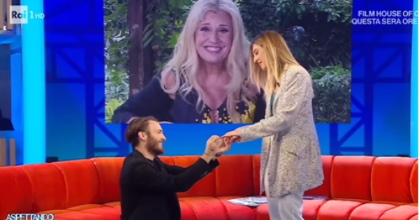 Collegata in video anche la mamma di Guenda, Maria Teresa Ruta, tra i concorrenti dell'attuale edizione di "Tale e Quale show", che emozionata ha dato la sua "benedizione" alla coppia che sta insieme già da alcuni anni.