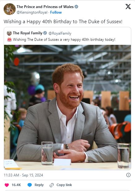 Dopo anni di tensioni, per la prima volta dal 2021 un messaggio di buon compleanno al principe ribelle sull'account della famiglia reale