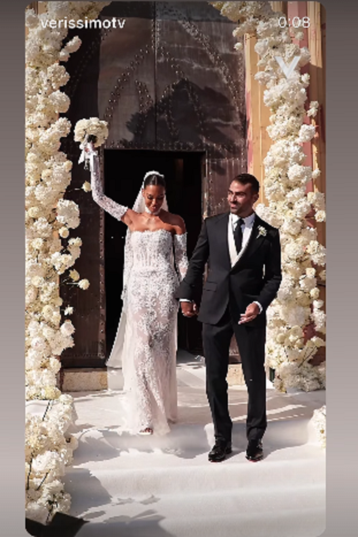Lei ha sfoderato tutto il suo fascino mediterraneo con due abiti, il primo per la cerimonia in chiesa (pizzo, bustier e strascico) e il secondo per il ricevimento.