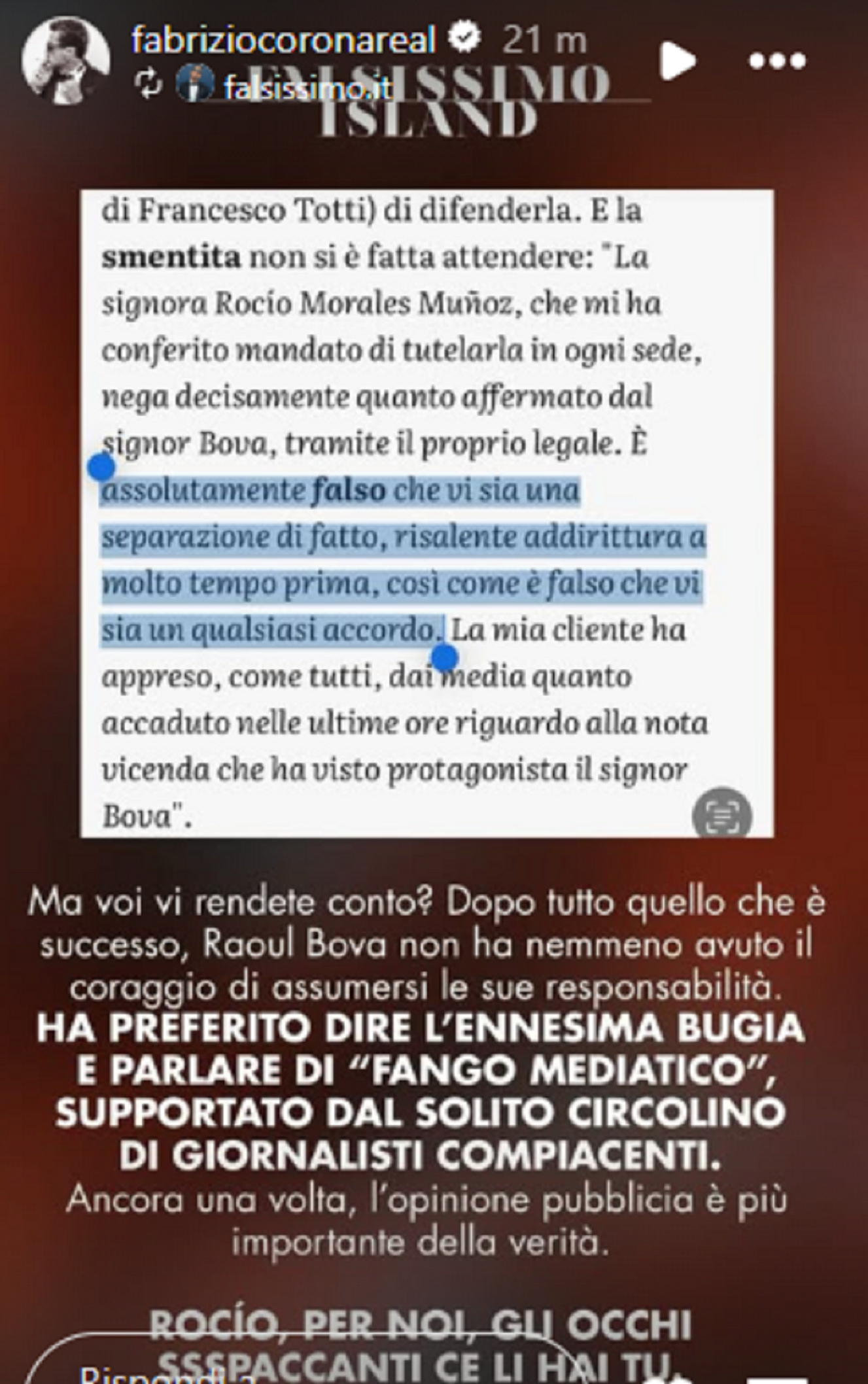 Corona commenta: "Rocìo per noi gli occhi più spaccanti li hai tu". Il riferimento è all'audio divulgato dal fotoreporter catanese in cui Bova rivolgeva complimenti alla giovane modella e influencer Martina Ceretti mentre sarebbe stato ancora legato all'attrice spagnola, madre delle sue due figlie (l'attore ha avuto altri due figli dall'ex moglie Chiara Giordano, ndr.). La Ceretti finora è rimasta in silenzio.