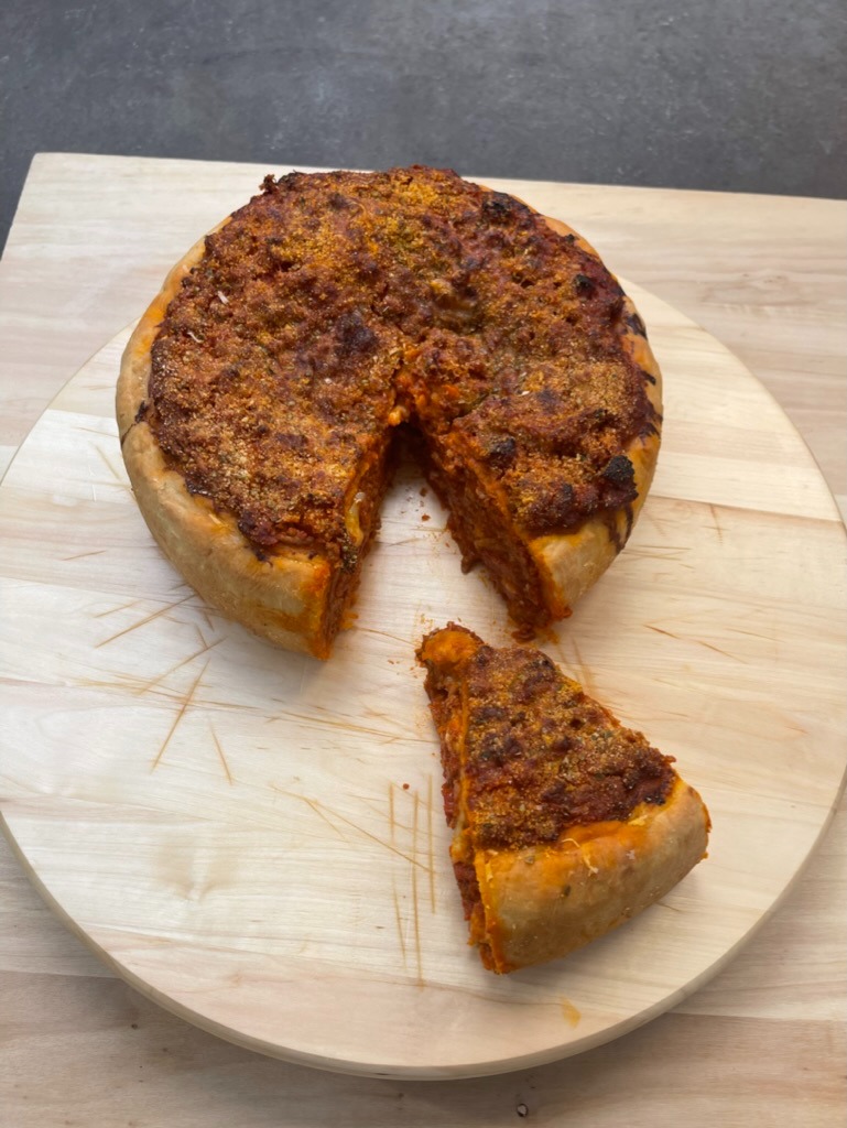 Coprire con l’impasto uno stampo a cerniera diametro 26 cm, togliendo i lembi in eccesso, quindi versare all’interno il ragù raffreddato e la tuma.