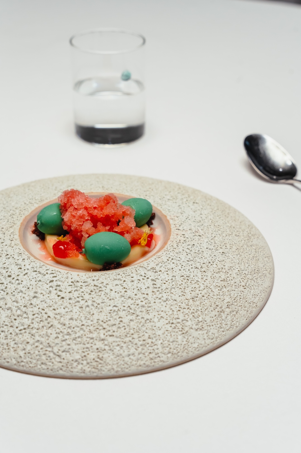 Un dolce che si ispira alla tradizione catanese: le “aliveddi” parlano di Catania e della festa tradizionale di Sant’Agata, spiega Ingiulla. Le nostre contengono una mousse di mandorla che profumiamo con vaniglia e scorza di limone, accompagnandole a una granita di anguria cotta. Ispirazione siciliana e contemporaneità.