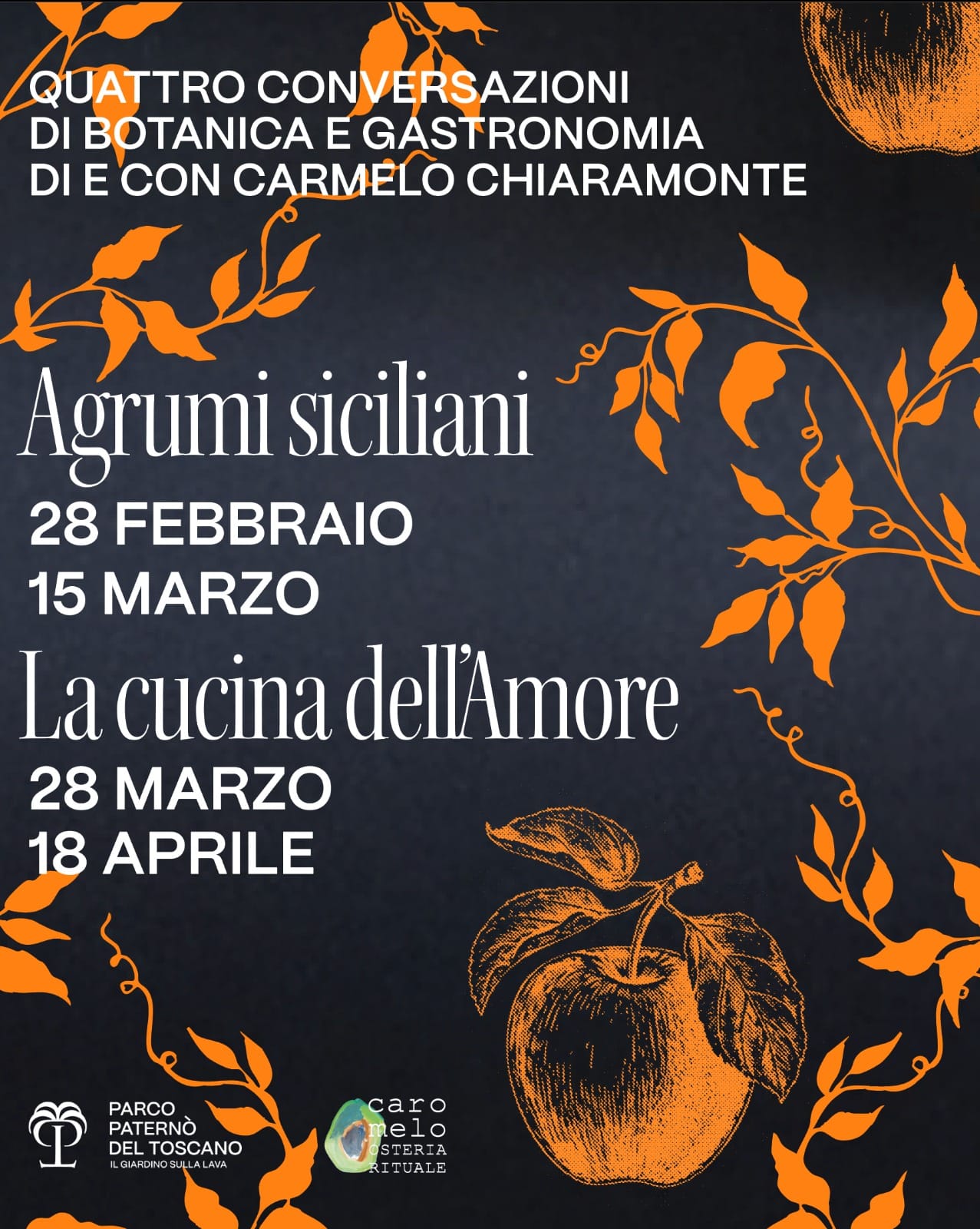 Il festival che si terrà nel Parco Paternò del Toscano (Sant'Agata li Battiati) è articolato in quattro appuntamenti: due incontri (sabato 28 febbraio alle 11 e domenica 15 marzo allo stesso orario) che punteranno sulla divulgazione. Perché l’arancia è pigmentata? Da dove nasce il colore rosso? Perché il navellino ha l'"ombelico”? Domande semplici, ma capaci di incuriosire anche chi non ha competenze botaniche. Le altre due date sono il 28 marzo e il 18 aprile, quando Chiaramonte porterà in scena "La cucina dell'amore".