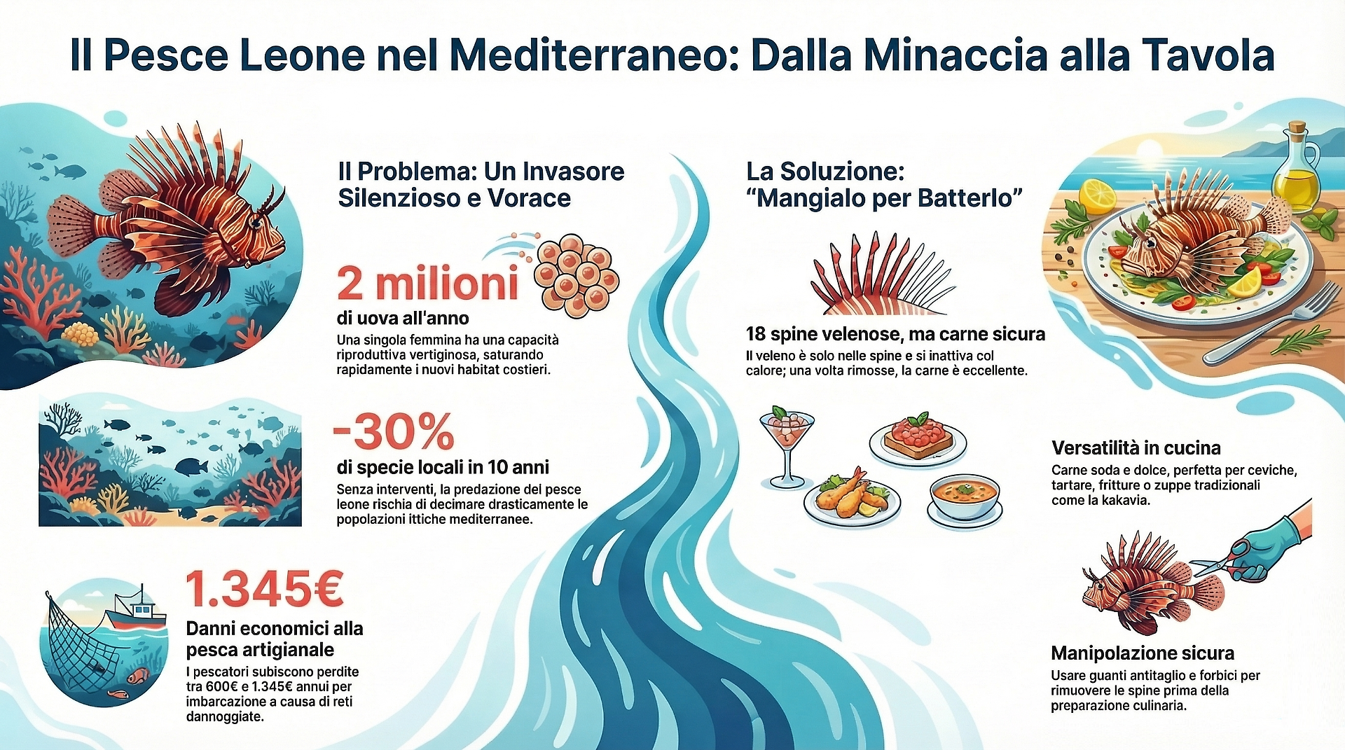 A Cipro, dove l’invasione è più avanzata, il prezzo del pesce leone è già competitivo e diverse taverne lo propongono con ottimi riscontri. Molti consumatori restano però diffidenti sulla sicurezza alimentare. È vero che le spine contengono una tossina pericolosa per chi le maneggia — veleno che si inattiva con il calore —, ma le carni, una volta pulite correttamente, sono del tutto sicure.