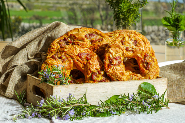 E' il momento in cui le famiglie preparano il Cucciddatu, un pane speciale che diventa offerta votiva e simbolo di abbondanza. La sua forma circolare nasce da una necessità pratica antica: permetteva ai pellegrini e ai cavalieri di infilarlo nel braccio o di appenderlo alla sella dei cavalli durante la rievocazione della Fuga in Egitto, portandolo in processione come offerta al Santo. La tradizione dei pani ripieni nasce dal recupero della pasta di pane, impasti avanzati che venivano arricchiti con ciò che c'era in casa: formaggi, salumi, verdure, pomodori, erbe aromatiche.