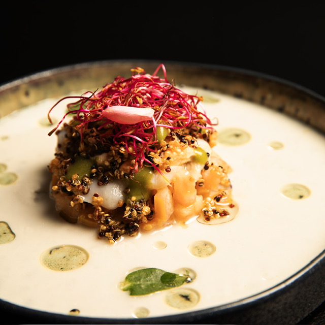 Capatosta: capasanta scottata, pomodoro, salsa di cocco, quinoa soffiata e olio al cardamomo