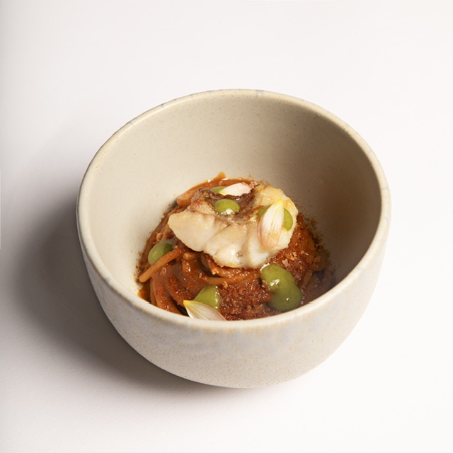 Niuru: spaghettone al nero di seppia, crema di sedano rapa, cozze, trippa di baccalà soffiata e limone