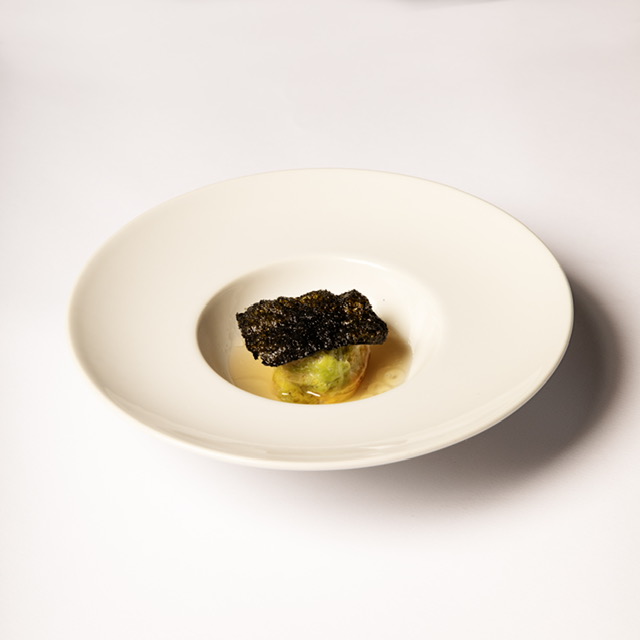 PapàTony: roll di verza ripieno di alalunga, alga nori soffiata, brodo di zenzero, olio al sesamo e gel di prezzemolo