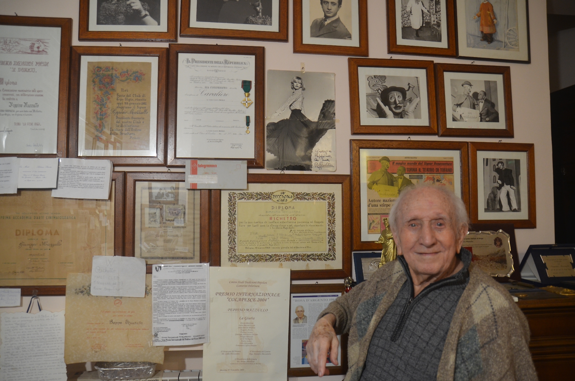 «Ognuno di noi ha il divino dentro, se tu lo svegli, fai cose divine». Peppino Mazzullo - 100 anni a giugno - attore siciliano di grande talento, il suo “divino” l’ha trovato nel dare vita e voce a un pupazzetto divenuto una star dell’animazione: Topo Gigio. Mazzullo è la voce storica del topo che ha “strapazzato di coccole” almeno tre generazioni. Lo testimoniano, le pareti del suo studio tappezzate di foto, riconoscimenti, ritagli di giornale, illustrazioni che raccontano la sua carriera di attore “per parti importanti” come recita il diploma dell’accademia d’Arte cinematografica di Roma. È proprio qui che ci riceve, nel palazzetto storico di Santo Stefano di Briga, duemila anime in provincia di Messina, dove vive con la moglie Annamaria Dematteis, da quando s’è ritirato dalle scene nel 2004.