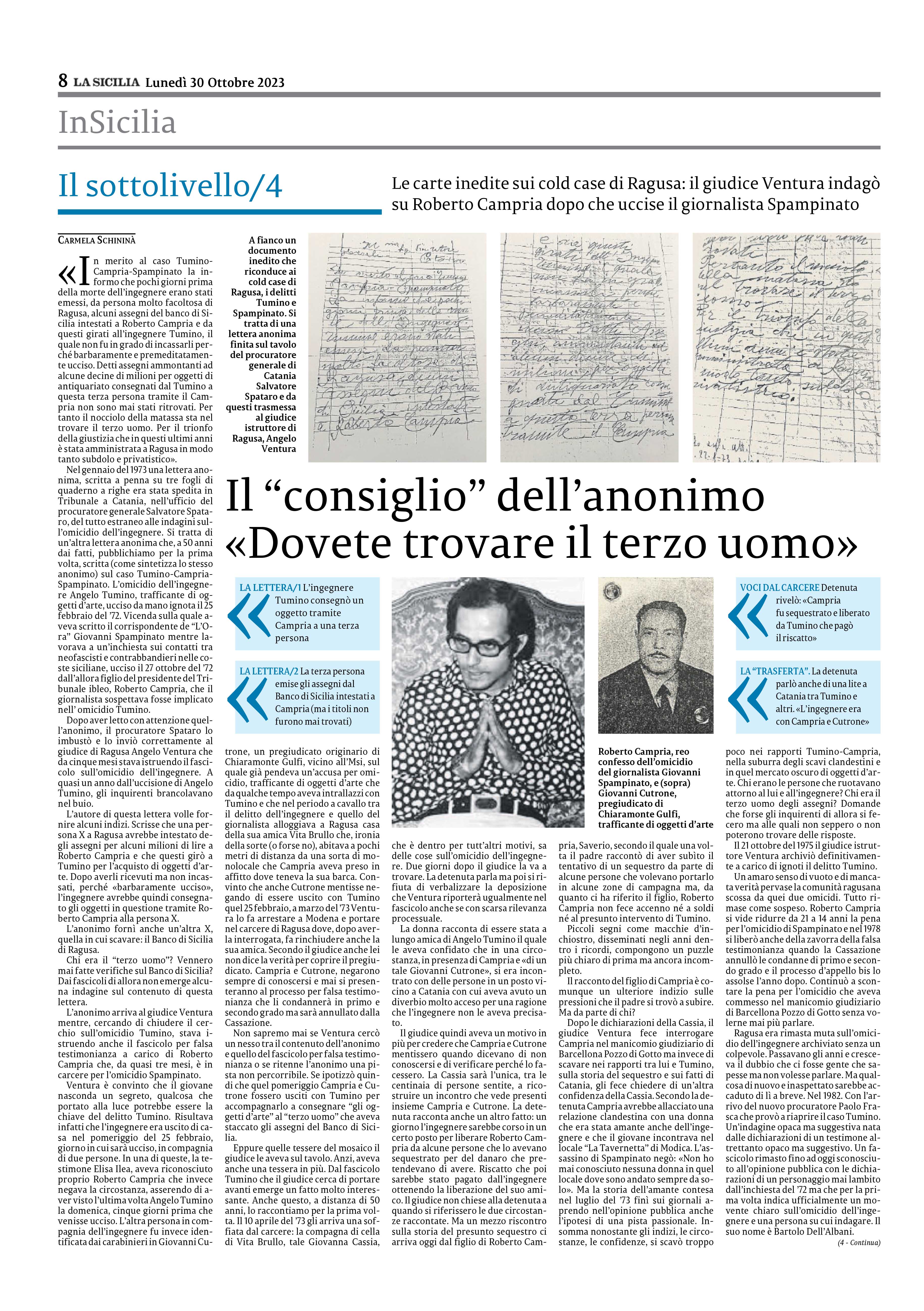 «In merito al caso Tumino-Campria-Spampinato la informo che pochi giorni prima della morte dell’ingegnere erano stati emessi, da persona molto facoltosa di Ragusa, alcuni assegni del banco di Sicilia intestati a Roberto Campria e da questi girati all’ingegnere Tumino, il quale non fu in grado di incassarli perché barbaramente e premeditatamente ucciso. Detti assegni ammontanti ad alcune decine di milioni per oggetti di antiquariato consegnati dal Tumino a questa terza persona tramite il Campria non sono mai stati ritrovati. Per tanto il nocciolo della matassa sta nel trovare il terzo uomo. Per il trionfo della giustizia che in questi ultimi anni è stata amministrata a Ragusa in modo tanto subdolo e privatistico». Nel gennaio del 1973 una lettera anonima, scritta a penna su tre fogli di quaderno a righe era stata spedita in Tribunale a Catania, nell’ufficio del procuratore generale Salvatore Spataro, del tutto estraneo alle indagini sull’omicidio dell’ingegnere. Si tratta di un’altra lettera anonima che, a 50 anni dai fatti, pubblichiamo per la prima volta, scritta (come sintetizza lo stesso anonimo) sul caso Tumino-Campria-Spampinato. L’omicidio dell’ingegnere Angelo Tumino, trafficante di oggetti d’arte, ucciso da mano ignota il 25 febbraio del ’72. Vicenda sulla quale aveva scritto il corrispondente de “L’Ora” Giovanni Spampinato mentre lavorava a un’inchiesta sui contatti tra neofascisti e contrabbandieri nelle coste siciliane, ucciso il 27 ottobre del ’72 dall’allora figlio del presidente del Tribunale ibleo, Roberto Campria, che il giornalista sospettava fosse implicato nell’ omicidio Tumino. Dopo aver letto con attenzione quell’anonimo, il procuratore Spataro lo imbustò e lo inviò correttamente al giudice di Ragusa Angelo Ventura che da cinque mesi stava istruendo il fascicolo sull’omicidio dell’ingegnere. A quasi un anno dall’uccisione di Angelo Tumino, gli inquirenti brancolavano nel buio.