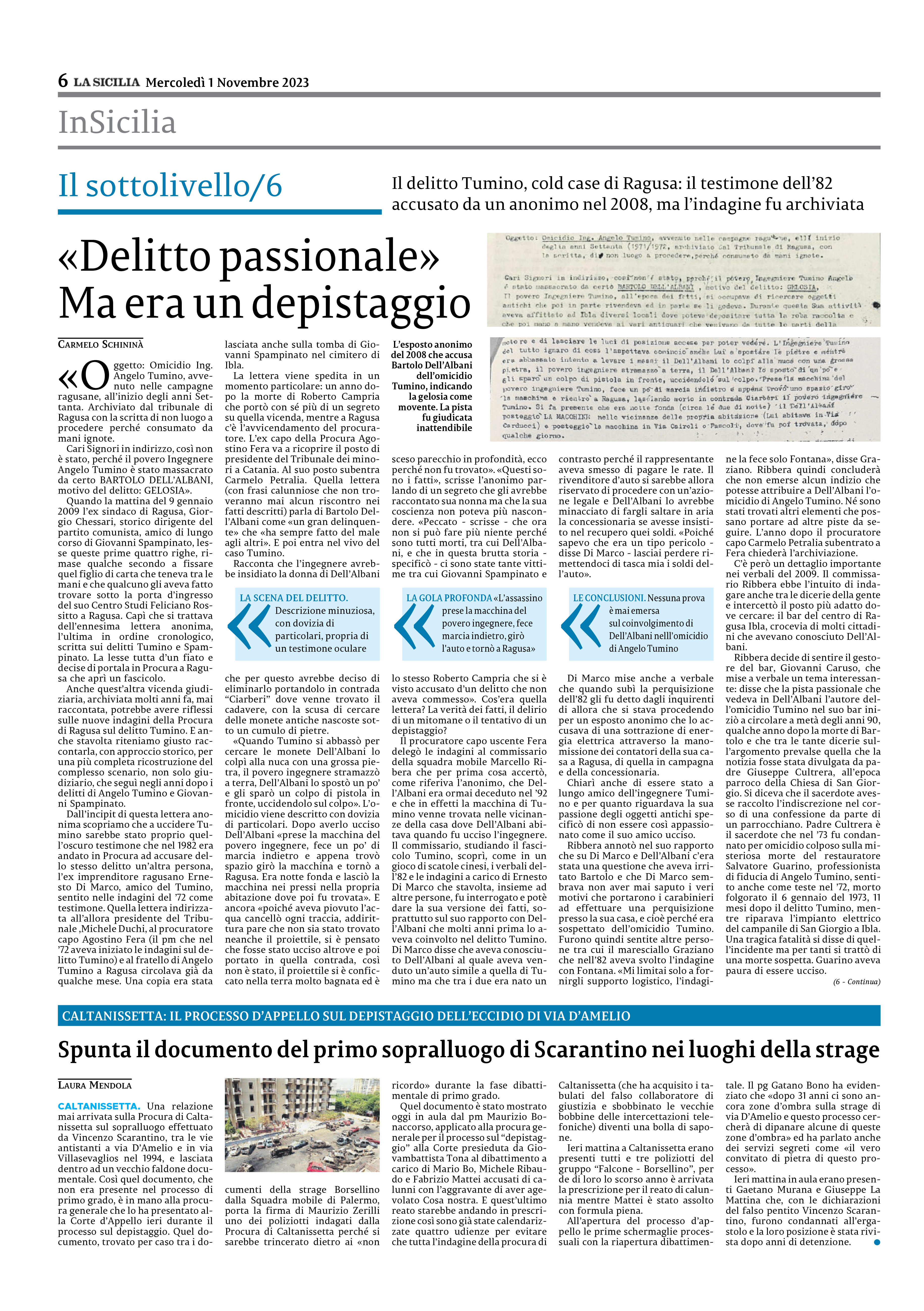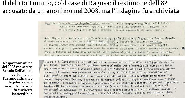 «Oggetto: Omicidio Ing. Angelo Tumino, avvenuto nelle campagne ragusane, all’inizio degli anni Settanta. Archiviato dal tribunale di Ragusa con la scritta di non luogo a procedere perché consumato da mani ignote. Cari Signori in indirizzo, così non è stato, perché il povero Ingegnere Angelo Tumino è stato massacrato da certo BARTOLO DELL’ALBANI, motivo del delitto: GELOSIA». Quando la mattina del 9 gennaio 2009 l’ex sindaco di Ragusa, Giorgio Chessari, storico dirigente del partito comunista, amico di lungo corso di Giovanni Spampinato, lesse queste prime quattro righe, rimase qualche secondo a fissare quel figlio di carta che teneva tra le mani e che qualcuno gli aveva fatto trovare sotto la porta d’ingresso del suo Centro Studi Feliciano Rossitto a Ragusa. Capì che si trattava dell’ennesima lettera anonima, l’ultima in ordine cronologico, scritta sui delitti Tumino e Spampinato. La lesse tutta d’un fiato e decise di portala in Procura a Ragusa che aprì un fascicolo. Anche quest’altra vicenda giudiziaria, archiviata molti anni fa, mai raccontata, potrebbe avere riflessi sulle nuove indagini della Procura di Ragusa sul delitto Tumino. E anche stavolta riteniamo giusto raccontarla, con approccio storico, per una più completa ricostruzione del complesso scenario, non solo giudiziario, che seguì negli anni dopo idelitti di Angelo Tumino e Giovanni Spampinato. Dall’incipit di questa lettera anonima scopriamo che a uccidere Tumino sarebbe stato proprio quell’oscuro testimone che nel 1982 era andato in Procura ad accusare dello stesso delitto un’altra persona, l’ex imprenditore ragusano Ernesto Di Marco, amico del Tumino, sentito nelle indagini del ’72 come testimone. Quella lettera indirizzata all’allora presidente del Tribunale ,Michele Duchi, al procuratore capo Agostino Fera (il pm che nel ’72 aveva iniziato le indagini sul delitto Tumino) e al fratello di Angelo Tumino a Ragusa circolava già da qualche mese. Una copia era stata lasciata anche sulla tomba di Giovanni Spampinato nel cimitero di Ibla. La lettera viene spedita in un momento particolare: un anno dopo la morte di Roberto Campria che portò con sé più di un segreto su quella vicenda, mentre a Ragusa c’è l’avvicendamento del procuratore. L’ex capo della Procura Agostino Fera va a ricoprire il posto di presidente del Tribunale dei minori a Catania. Al suo posto subentra Carmelo Petralia. Quella lettera (con frasi calunniose che non troveranno mai alcun riscontro nei fatti descritti) parla di Bartolo Dell’Albani come «un gran delinquente» che «ha sempre fatto del male agli altri». E poi entra nel vivo del caso Tumino.