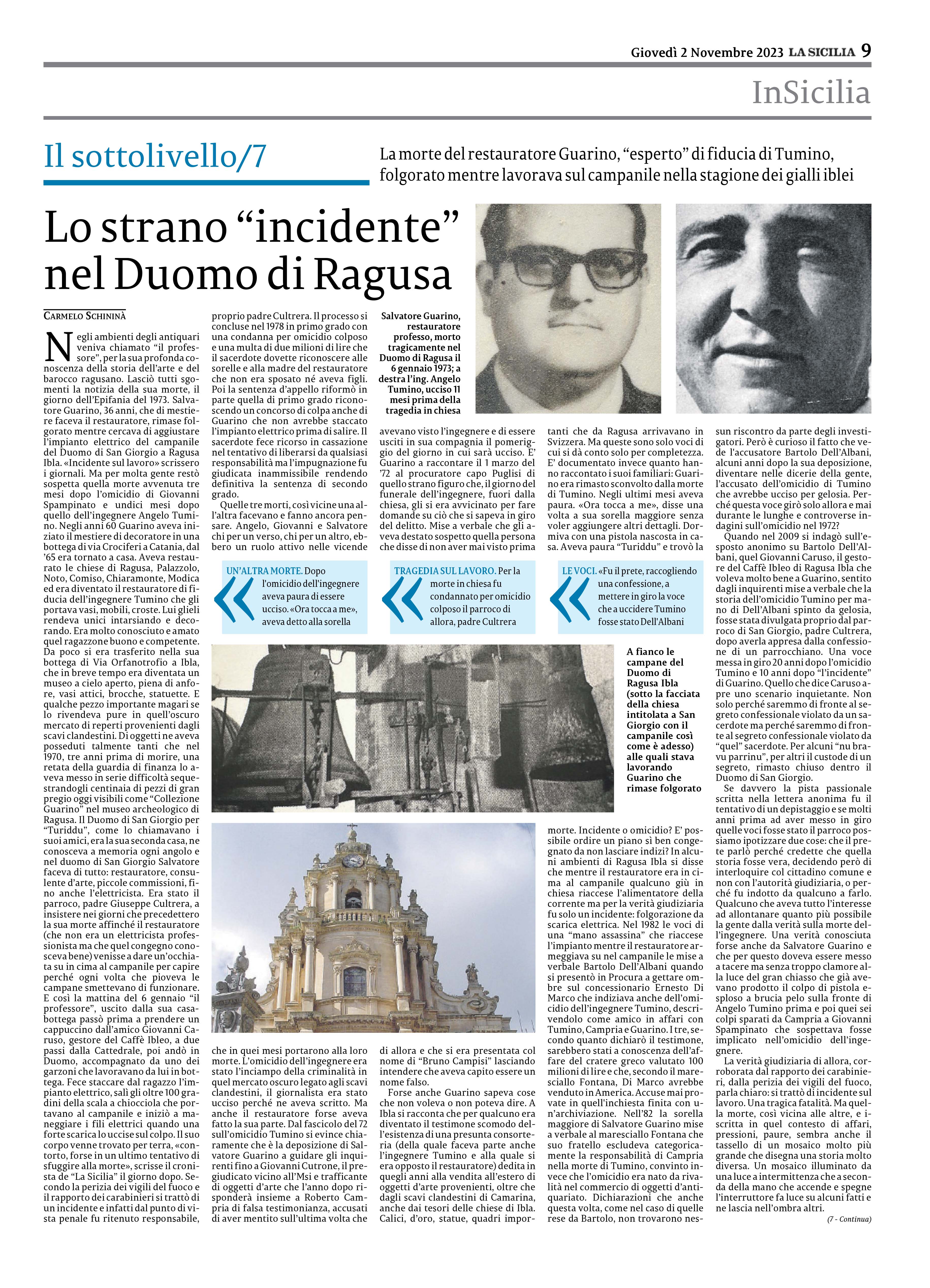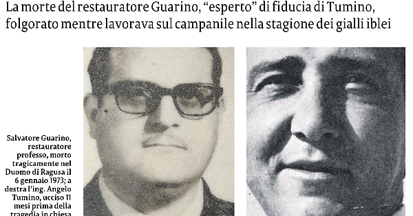 Negli ambienti degli antiquari veniva chiamato “il professore”, per la sua profonda conoscenza della storia dell’arte e del barocco ragusano. Lasciò tutti sgomenti la notizia della sua morte, il giorno dell’Epifania del 1973. Salvatore Guarino, 36 anni, che di mestiere faceva il restauratore, rimase folgorato mentre cercava di aggiustare l’impianto elettrico del campanile del Duomo di San Giorgio a Ragusa Ibla. «Incidente sul lavoro» scrissero i giornali. Ma per molta gente restò sospetta quella morte avvenuta tre mesi dopo l’omicidio di Giovanni Spampinato e undici mesi dopo quello dell’ingegnere Angelo Tumino. Negli anni 60 Guarino aveva iniziato il mestiere di decoratore in una bottega di via Crociferi a Catania, dal ’65 era tornato a casa. Aveva restaurato le chiese di Ragusa, Palazzolo, Noto, Comiso, Chiaramonte, Modica ed era diventato il restauratore di fiducia dell’ingegnere Tumino che gli portava vasi, mobili, croste. Lui glieli rendeva unici intarsiando e decorando. Era molto conosciuto e amato quel ragazzone buono e competente.