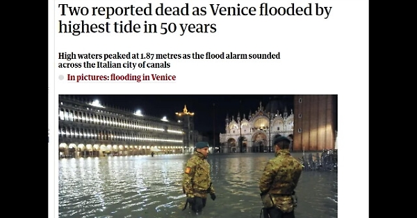 ROMA, 13 NOV - La notizia dell'acqua alta da record a Venezia è rimbalzata in fretta sui media di tutto il mondo. "Inondazioni a Venezia, il cambiamento climatico dietro alla marea più alta degli ultimi 50 anni" titola in apertura il sito della Bbc, citando le parole del sindaco Luigi Brugnaro che parla di un evento destinato a lasciare "segni indelebili" sulla città. Anche la Cnn dà risalto alla "peggiore acqua alta degli ultimi 50 anni", registrando le vittime e la richiesta dello stato di emergenza per la città, mentre un gran numero di media internazionali esprime preoccupazione per il destino dell'immenso patrimonio storico e artistico che la città custodisce. "Venezia colpita da una storica acqua alta, preoccupazione per mosaici e opere d'arte", scrive Fox news. L'inglese Sun, parla di situazione "apocalittica", e si chiede se Venezia non stia progressivamente affondando. Moltissime le foto e i video che documentano queste ore sui mezzi di comunicazione di tutto il mondo, e i commenti sui social.