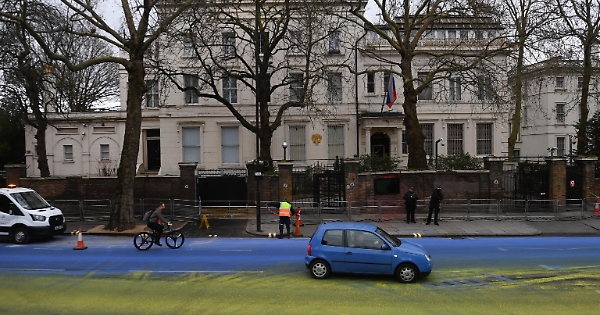 Londra, attivisti verniciano giallo-blu strada ambasciata russa