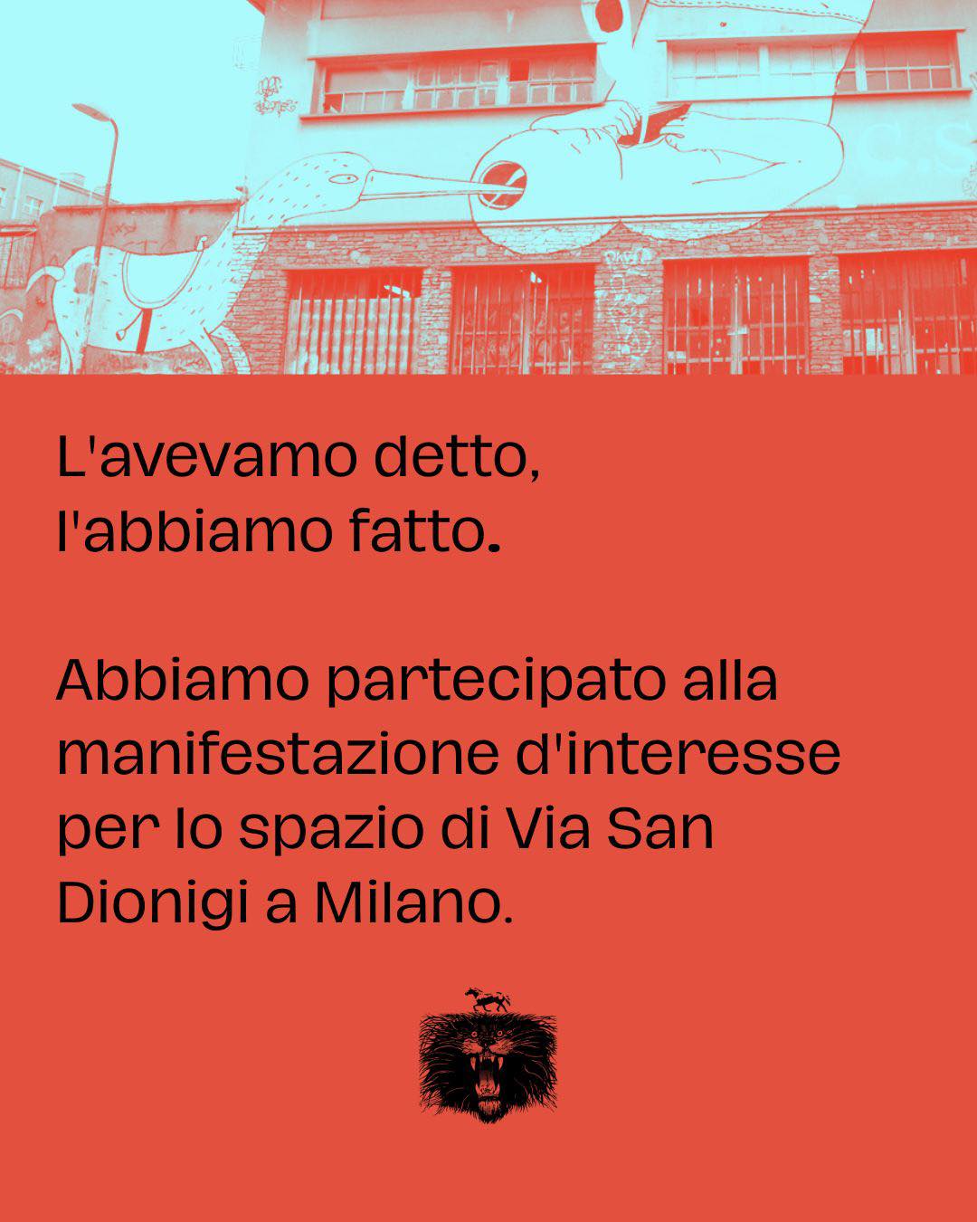 «L'avevamo detto, l’abbiamo fatto. Abbiamo partecipato alla manifestazione d’interesse per lo spazio di via San Dionigi a Milano». A scriverlo i militanti del centro sociale Leoncavallo di Milano sui social, in riferimento al bando del Comune che dà in concessione un immobile in via San Dionigi, che scade oggi alle 12. E il centro sociale Leoncavallo ha presentato un offerta, perché quella potrebbe essere la sua nuova sede dopo lo sfratto dello scorso agosto dai locali di via Watteau.
