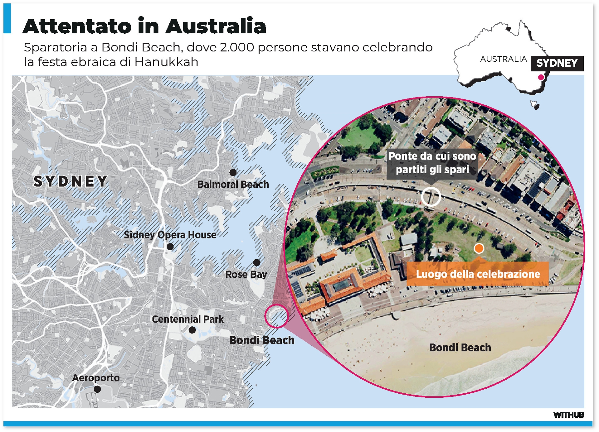 La bambina tiene stretta la candela di cera, la custodisce con le mani a coppa per proteggere la fiamma dal vento salmastro. Sullo sfondo, il mare di Bondi Beach respira lento, come ogni sera d’estate australe. Alle 18,40-18,47 (ora locale), secondo le prime ricostruzioni, una sequenza di colpi spezza il brusio della festa: due figure vestite di scuro, su un piccolo ponte che scavalca la strada e il parcheggio vicino al parco giochi, aprono il fuoco verso la folla radunata per “Chanukah by the Sea”, l’evento organizzato da Chabad of Bondi. In circa dieci minuti, la “festa della luce” si trasforma in un caos di sirene, urla, fughe, corpi a terra, soccorritori che improvvisano triage tra le giostre.