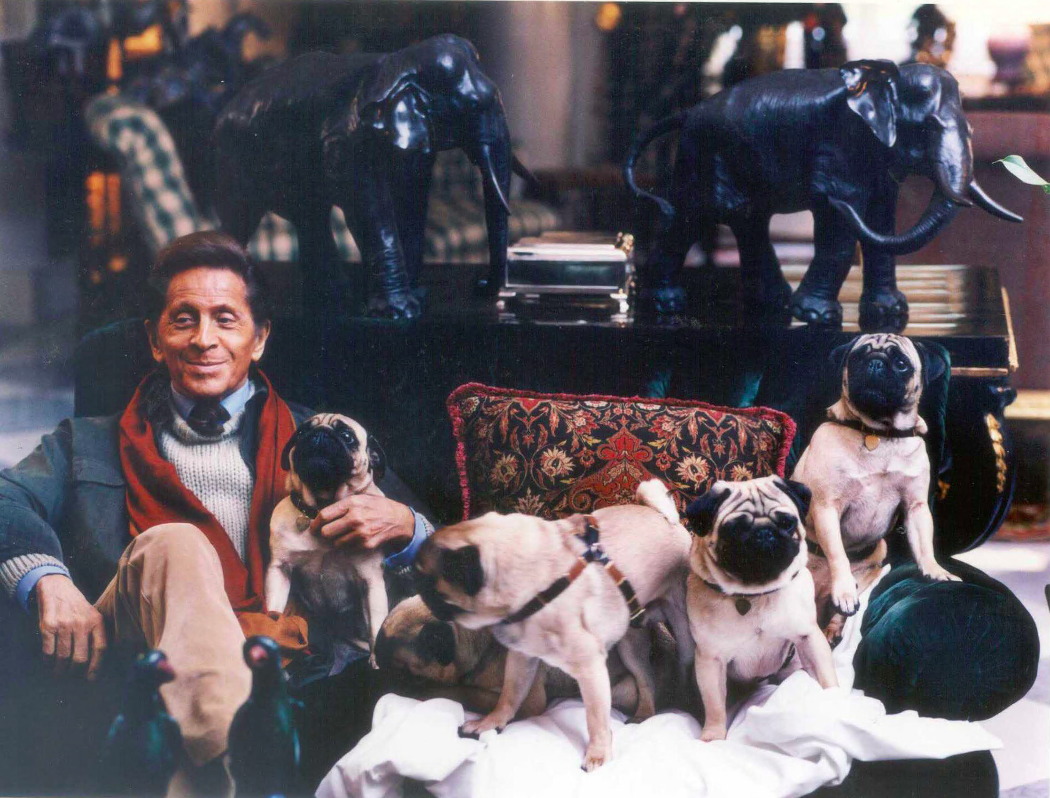 O il ricevimento, nel 2006, al castello di Wideville, appena fuori Parigi, per festeggiare la Legion d’Onore, un castello amato e sede di numerosi esclusivi e lussuosi party organizzati anche per le amiche-clienti. Immerso nel verde, con giardini scenografici e interni raffinati, il castello è stato teatro di sfilate private, eventi culturali e incontri con artisti e collezionisti. E poi le case a Parigi, Roma, Capri, Gstaad in Svizzera, dove soggiornava circondato dalla bellezza, da uno stile che non seguiva le mode, dagli amici e dagli amati cani carlini.