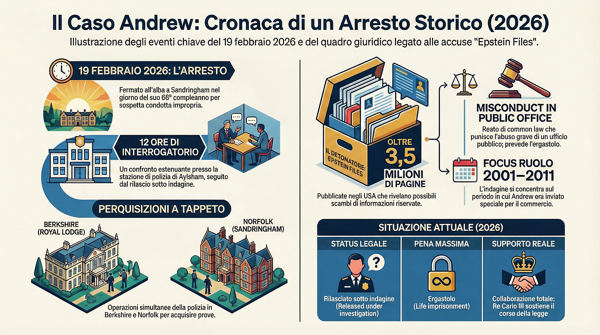 L'arresto è scattato all'alba di quella stessa giornata, quando gli agenti si sono presentati a Wood Farm, nella tenuta di Sandringham, per poi estendere le perquisizioni anche al Royal Lodge a Windsor, nel Berkshire. Il comunicato della Thames Valley Police ha mantenuto toni misurati e, come da prassi per evitare la contempt of court, non ha diffuso il nome dell'arrestato, ma ha chiarito il capo di accusa: sospetta misconduct in public office (cattiva condotta nell'esercizio di una funzione pubblica). La scelta di condurre l'interrogatorio in una stazione periferica come Aylsham e di mantenere un basso profilo mediatico risponde a una chiara strategia: sottrarre l'indagine al clamore per proteggere testimoni e piste, ribadendo che la legge è uguale per tutti.