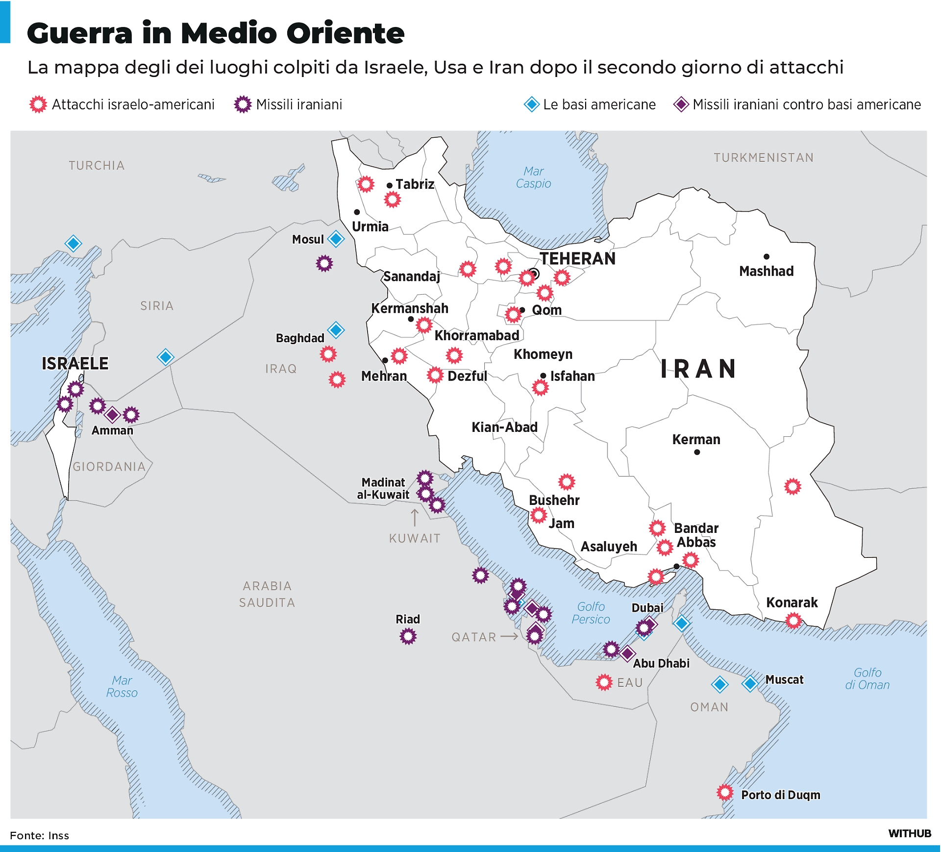 Secondo giorno di ostilità: Teheran e infrastrutture militari sotto attacco, mentre i Pasdaran rispondono con missili verso Israele e basi statunitensi nel Golfo.