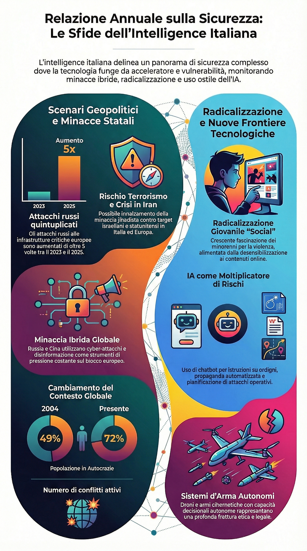 Il vero "fil rouge" di tutte queste minacce è la tecnologia, che come sottolineato dal direttore Rizzi funge sia da "acceleratore dei processi" che da enorme "vulnerabilità" sistemica. L'intelligenza artificiale gioca ormai un ruolo da protagonista, piegata alle esigenze del terrorismo. Emerge in Italia e all'estero l'uso consolidato di chatbot in grado di fornire persino istruzioni per il confezionamento di ordigni esplosivi. Inoltre, l'IA viene impiegata per la generazione automatica di propaganda estremista, il finanziamento illecito e la pianificazione operativa di attacchi. Infine, l'intelligence lancia un severo monito sui sistemi d'arma autonomi, come i droni capaci di decidere in autonomia o le armi cibernetiche. Tali strumenti, avvertono gli 007, rappresentano oggi "una delle fratture etiche e legali più profonde aperte dalla tecnologia contemporanea".
