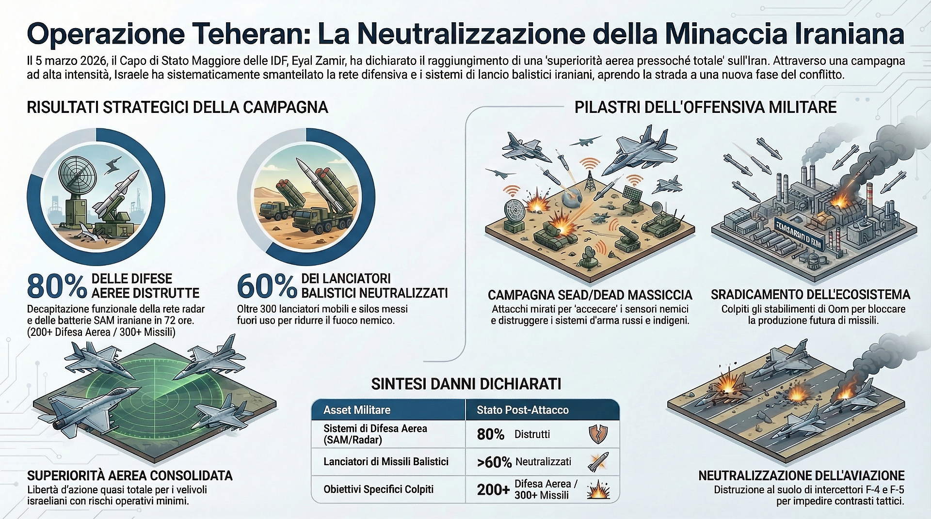 Il bollettino israeliano poggia su tre direttrici fondamentali: soppressione della minaccia balistica, devastazione delle difese aeree (IADS) e controllo dei cieli. La neutralizzazione di oltre il 60% dei lanciatori non si è limitata ai sistemi mobili e ai silos, ma ha logorato alla base la capacità di Teheran di sostenere salve prolungate. L'operazione militare ha mirato a tagliare le vere e proprie "radici" industriali del programma missilistico, colpendo le linee di assemblaggio, i depositi e gli hub nevralgici, come quelli situati nell'area di Qom. L'obiettivo dichiarato da Israele, supportato da un impressionante volume di oltre 1.000 sortite in tre giorni, è far retrocedere drasticamente l'orologio del potenziale bellico iraniano, spingendosi ben oltre i risultati ottenuti nel precedente conflitto del giugno 2025.