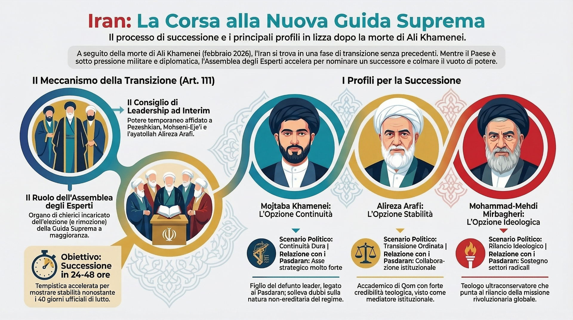 Nel cono d’ombra di un sistema dove i Pasdaran e le grandi fondazioni religiose muovono fili decisivi dietro le quinte, emergono tre profili principali, pur in assenza di indicazioni ufficiali: Mojtaba Khamenei, 56 anni, secondogenito della Guida scomparsa e figura legata ai Pasdaran. Incarna l’opzione della “continuità dura”: la sua eventuale investitura sancirebbe, di fatto, una “dinastia rivoluzionaria”, in contraddizione con il principio non ereditario della Repubblica. Considerato il favorito, non raccoglie tuttavia un consenso unanime nell’establishment clericale; Ayatollah Alireza Arafi, accademico di Qom e già membro del Consiglio ad interim. È percepito come il candidato della “transizione ordinata”: un architetto istituzionale capace di mediare tra le scuole teologiche e garantire un passaggio di fase senza strappi; Mohammad-Mehdi Mirbagheri, teologo ultraconservatore. La sua ascesa imprimerebbe un deciso “rilancio ideologico” alla missione islamica dello Stato, con una postura regionale ancor più rigida nel confronto con l’asse USA-Israele.