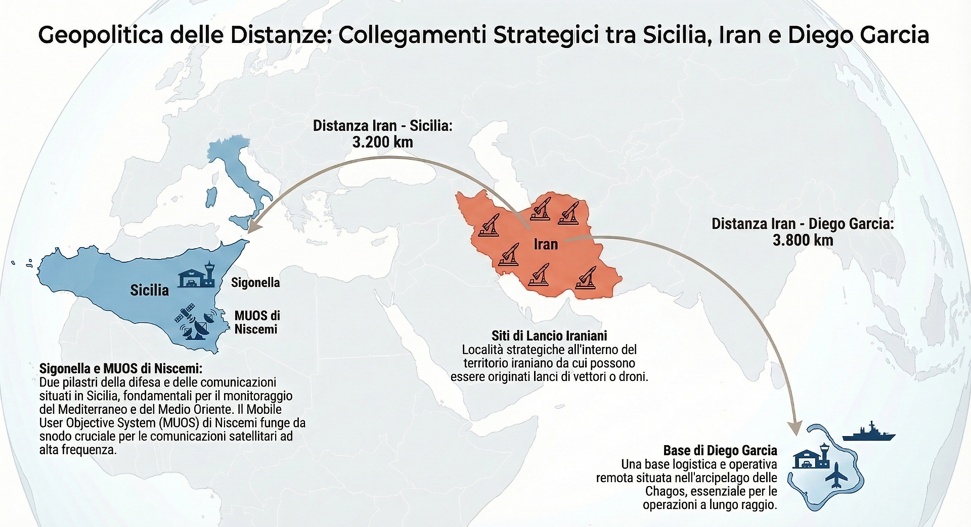 Se l'Iran ha lanciato un attacco sulla base di Diego Garcia anche Sigonella e il Muos di Niscemi sono nel raggio d'azione dei missili: perché cambia lo scenario