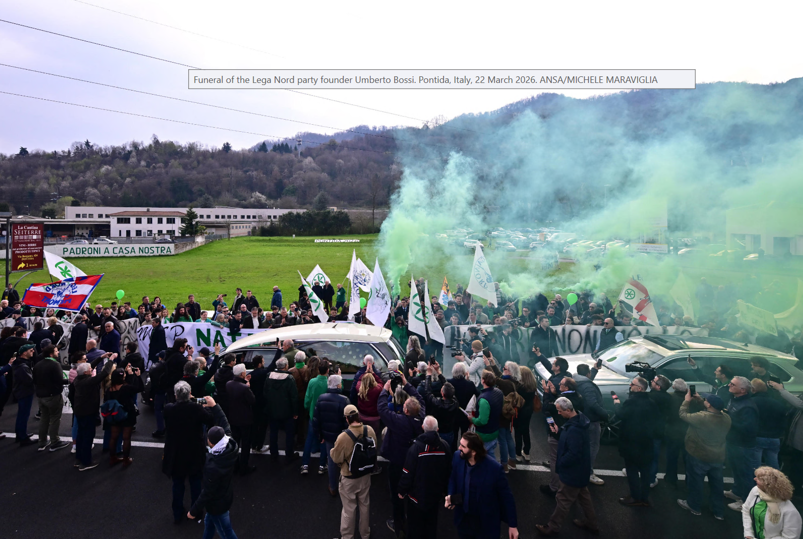 Applausi dei militanti e le bandiere con il sole delle Alpi salutano il feretro di Umberto Bossi mentre passa davanti al pratone di Pontida, il "suolo sacro" per la Lega dove ogni anno si tiene il suo raduno.