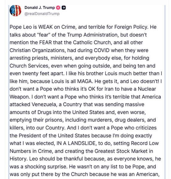 Da un lato Donald Trump, che con un post al vetriolo su Truth Social ha accusato Papa Leone XIV di essere “debole sul crimine” e “terribile in politica estera”.