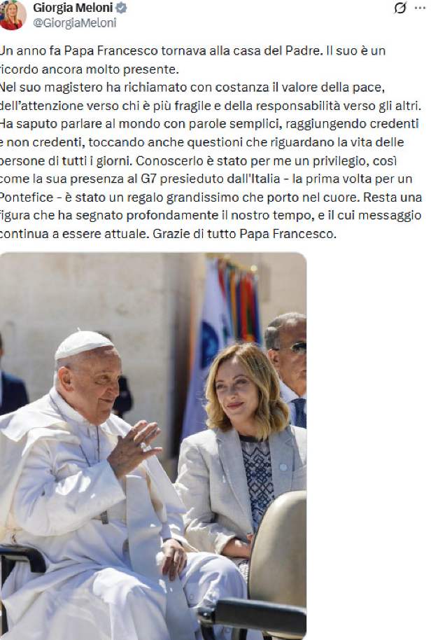 Anche la premier Giorgia Meloni lo ricorda con un post su X. «Nel suo magistero ha richiamato con costanza il valore della pace, dell’attenzione verso chi è più fragile e della responsabilità verso gli altri. Ha saputo parlare al mondo con parole semplici, raggiungendo credenti e non credenti, toccando anche questioni che riguardano la vita delle persone di tutti i giorni. Conoscerlo è stato per me un privilegio, così come la sua presenza al G7 presieduto dall’Italia - la prima volta per un Pontefice - è stato un regalo grandissimo che porto nel cuore. Resta una figura che ha segnato profondamente il nostro tempo, e il cui messaggio continua a essere attuale. Grazie di tutto Papa Francesco».