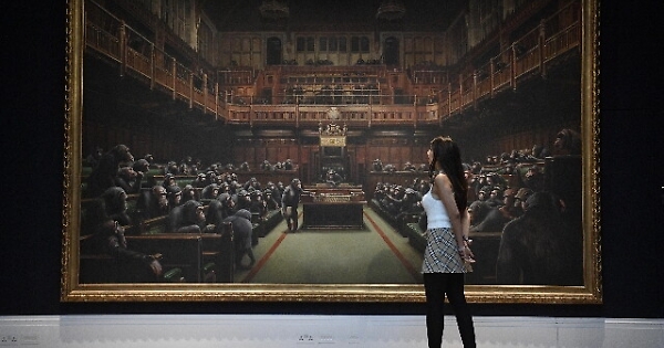ROMA, 3 OTT - Un dipinto di Banksy, è stato venduto all'asta da Sotheby's di Londra a 11,1 milioni di euro, una cifra record per l'artista britannico noto soprattutto per i suoi provocatori murales da strada. Si tratta di "Devolved Parliament", che raffigura, in stile accademico, la Camera dei comuni di Westminster in cui i deputati sono tutti scimpanzé. Il precedente record per un'opera di Banksy apparteneva a "Keep it Spotless", che nel 2008 andò all'incanto per Sotheby's a New York per 1,8 milioni di dollari.