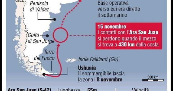 BUENOS AIRES, 23 NOV - E' stato rilevato "un nuovo indizio", una "anomalia idro-acustica, un rumore" che potrebbe provenire dall'Ara San Juan, il sottomarino argentino disperso da una settimana nell'Atlantico del Sud. A dirlo è stato il portavoce della Marina militare argentina, Enrique Balbi. Balbi ha spiegato che il "rumore" sarebbe stato rilevato una settimana fa, il 15 novembre, circa 30 miglia a nord dal punto dal quale il San Juan si era messo in contatto per ultima volta col comando della Marina. Interrogato sulla possibilità che il rumore fosse un'esplosione, Balbi ha precisato che "non abbiamo informazioni al riguardo e non formuliamo nessuna congettura".