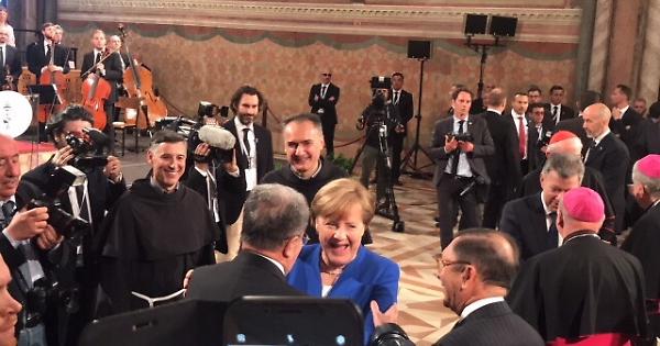 ASSISI (PERUGIA), 12 MAG - Saluto caloroso tra Angela Merkel e Romano Prodi all'interno della Basilica Superiore di Assisi, dove la cancelliera riceve la lampada della pace. La cancelliera tedesca dopo aver attraversato la navata centrale della Basilica è giunta davanti all'altare dove in prima fila siede l'ex presidente del Consiglio e della Commissione europea. Merkel lo ha abbracciato sorridendo. Tra i due c'è stato un breve scambio di battute e poi la cancelliera ha guadagnato il suo posto accanto al presidente della Repubblica colombiana Juan Manuel Santos.