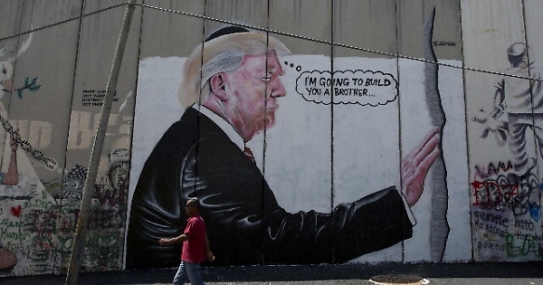 (ANSAmed) - TEL AVIV, 4 AGO - Un alone di mistero accompagna oggi a Betlemme (Cisgiordania) l'improvvisa comparsa sulla barriera di cemento eretta da Israele di una grande immagine realistica di Donald Trump. Il presidente statunitense e' rappresentato mentre abbraccia con trasporto una torretta militare israeliana. A Trump vengono attribuite anche le parole ''Ti costruirò un fratello'': una allusione ai suoi progetti di costruire lungo il confine col Messico una analoga barriera di sicurezza. Fonti locali precisano che accanto a questi graffiti e' stata apposta la firma: @LushSux. In passato sulla stessa barriera di cemento si sono esibiti diversi artisti fra cui il celebre Bansky che a Betlemme ha anche aperto un piccolo albergo.