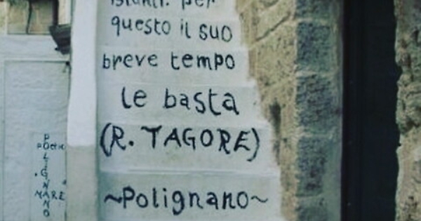 POLIGNANO A MARE (BARI), 21 NOV - Una poesia dello scrittore indiano Tagore riportata dall'artista Guido 'Il Flaneur' su una scalinata di Polignano a Mare è stata cancellata e ricoperta con calce bianca. Si tratta di uno degli scorci tra i più fotografati della perla pugliese, sfondo di migliaia di selfie postati sul web dai turisti. Sui muri di Polignano sono numerose le scritte in cui sono riportati stralci o intere poesie che si possono ammirare. Secondo quanto riferisce il sindaco, Domenico Vitto, la cancellazione della poesia di Tagore 'La farfalla non conta gli anni ma gli istanti: per questo il suo breve tempo le basta' sarebbe addebitabile a privati. Quasi tutte le iscrizioni sono riportate su muri di abitazioni i cui proprietari possono disporne come credono, non essendoci alcuna tutela specifica. "Sono un grande sostenitore di Guido - ha spiegato Vitto all'ANSA - e siamo ben consapevoli del valore delle sue opere d'arte. Il nostro intento è valorizzarle, e ci muoveremo subito perché ciò sia possibile".