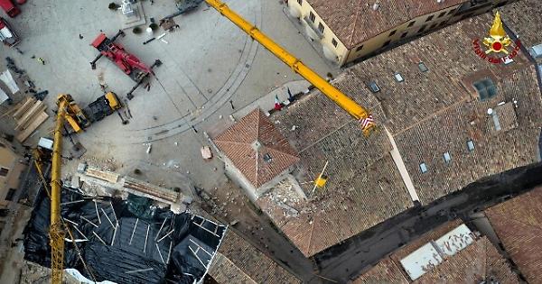 NORCIA (PERUGIA), 8 NOV - Cinque candelabri del Quattrocento sono stati recuperati dai vigili del fuoco da ciò che resta della Basilica di San Benedetto a Norcia quasi completamente crollata per il terremoto. Uno risulta danneggiato. I vigili del fuoco stanno operando con personale specializzato e diversi mezzi meccanici. I candelabri saranno ora portati nel deposito per le opere d'arte provenienti dalle zone colpite dal terremoto allestito dal ministero per i Beni culturali a Santo Chiodo di Spoleto. Sono state intanto quasi completamente coperte da pesanti teli di plastica le rovine della Basilica di San Benedetto. I vigili del fuoco hanno infatti praticamente ultimato l'intervento per proteggere ciò che resta della chiesa dedicata al patrono d'Europa. I teli sono stati sistemati sopra a una intelaiatura in legno. Struttura che permette di riparare dalle intemperie il materiale crollato e altri oggetti che si dovessero trovare sotto.