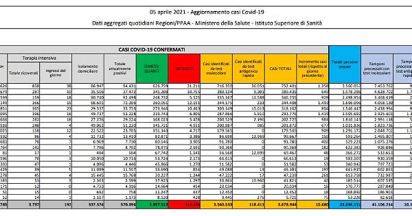 ROMA (ITALPRESS) - Sono 10.680 i nuovi casi di Coronavirus in Italia (ieri 18.025) a fronte di 102.795 tamponi effettuati su un totale di 51.302.838 da inizio emergenza. E' quanto si legge nel bollettino del Ministero della Salute - Istituto Superiore di Sanita' di oggi. Nelle ultime 24 ore sono stati 296 i decessi (ieri 326), che portano il totale di vittime da inizio pandemia a 111.326 Con quelli di oggi diventano 3.678.944 i casi totali di Covid in Italia. Attualmente i positivi sono 570.096 (+1.061), 537.574 le persone in isolamento domiciliare. I ricoverati in ospedale con sintomi sono 28.784 di cui 3.737 in Terapia intensiva. I dimessi/guariti sono 2.997.522 con un incremento di 9.323 unita' nelle ultime 24 ore. La regione con il maggior numero di nuovi casi nelle ultime 24 ore e' l'Emilia-Romagna (1.493), seguita dal Lazio (1.419), dalla Lombardia (1.358) e dalla Toscana (981). (ITALPRESS). spf/sat/red 05-Apr-21 18:12