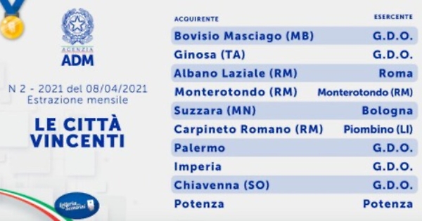 Tre dei 10 premi da 100 mila euro sono andati in provincia di Roma, mentre altri tre nel Sud Italia. Di seguito la provenienza degli scontrini vincenti: - Bovisio Masciago (Mb) - Ginosa (Ta) - Albano Laziale (Rm) - Monterotondo (Rm) - Suzzara (Mn) - Carpineto Romano (Rm) - Palermo - Imperia - Chiavenna (So) - Potenza.